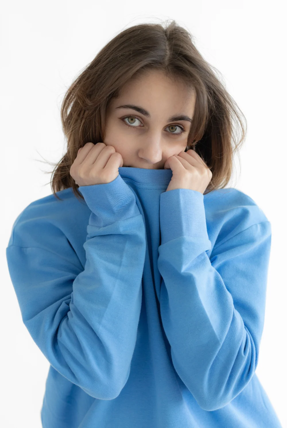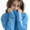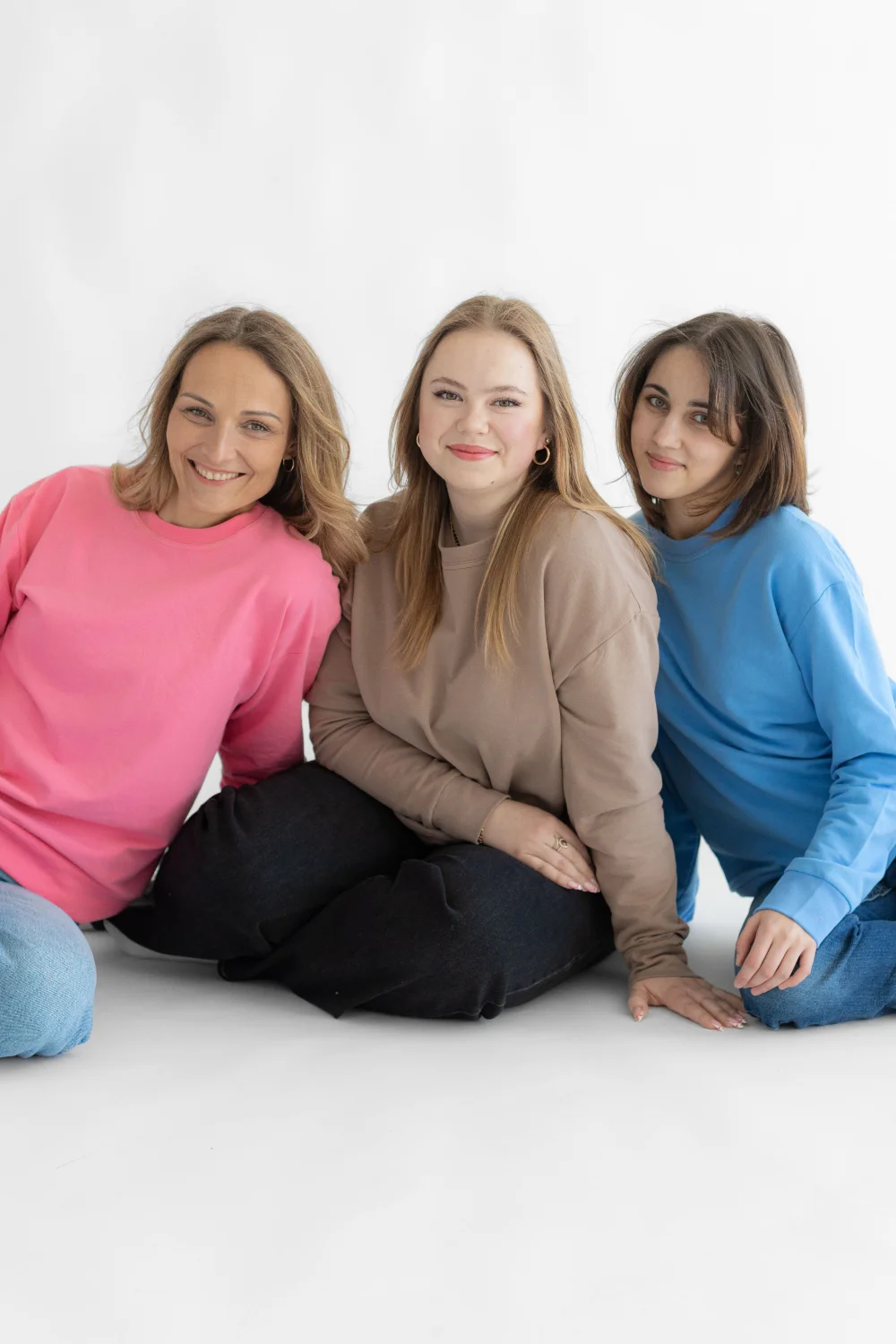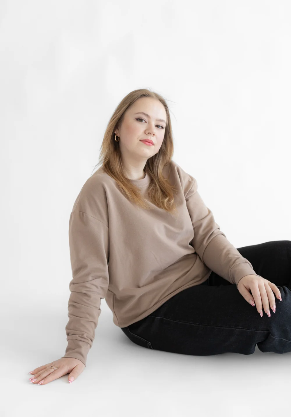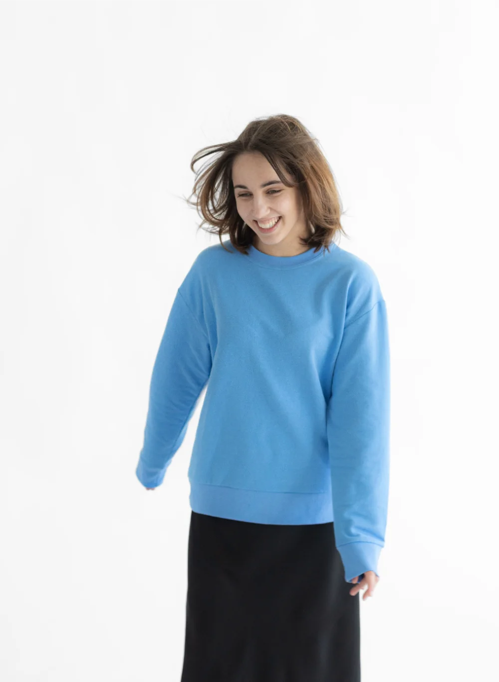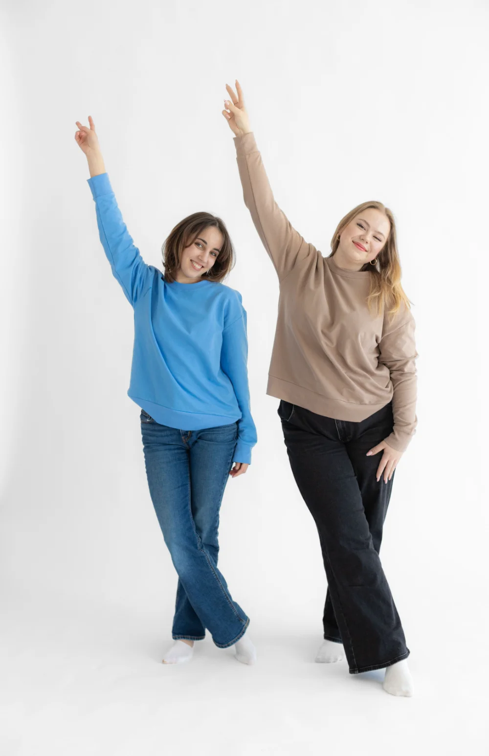 Šūts no kvalitatīvas un sertficētas kokvilnas trikotāžas. Auduma kreisajā pusē ir neliela pūciņa, bet pats džemperis ir vidēja biezuma, to noteikti varēsi kompakti salocīt un ielikt somā, ja paliek par karstu.