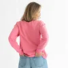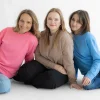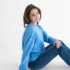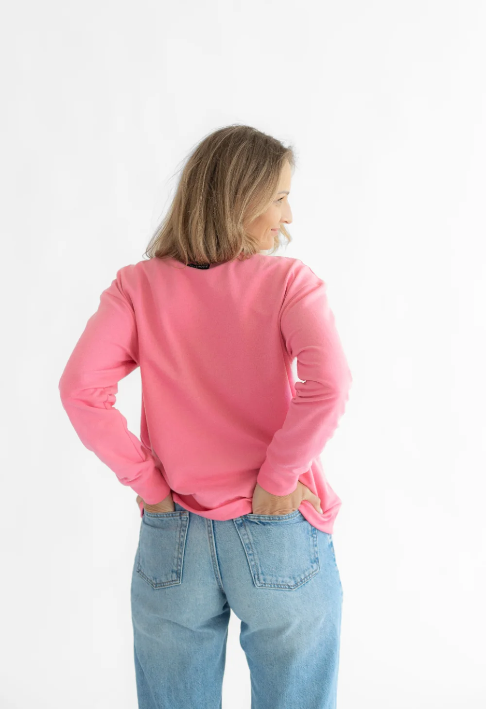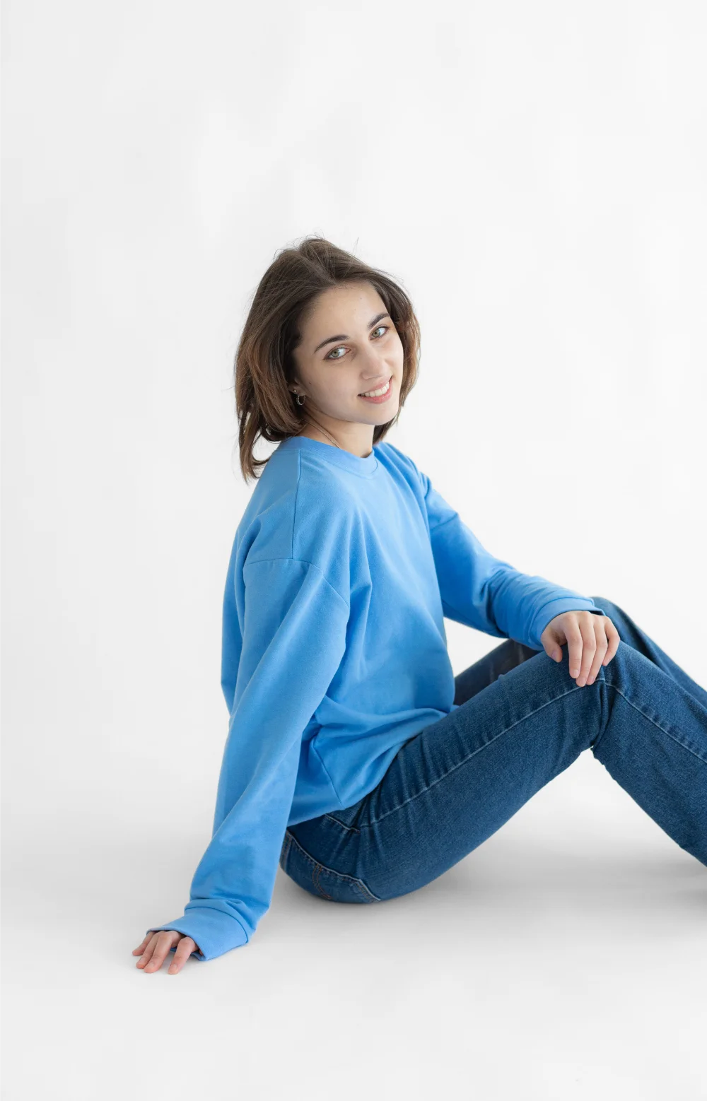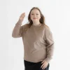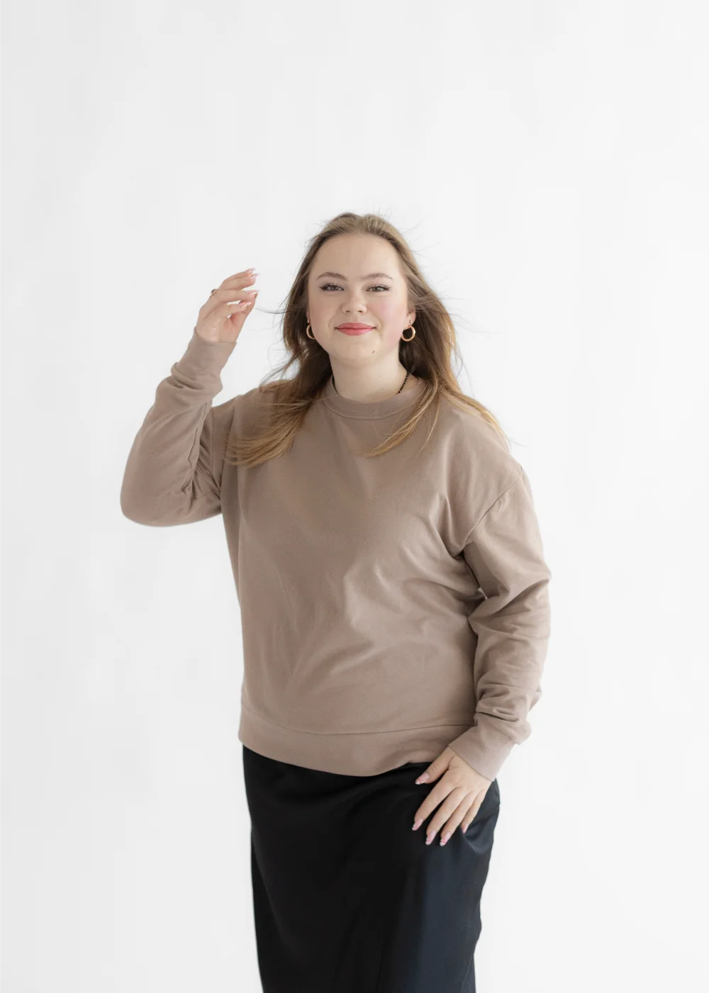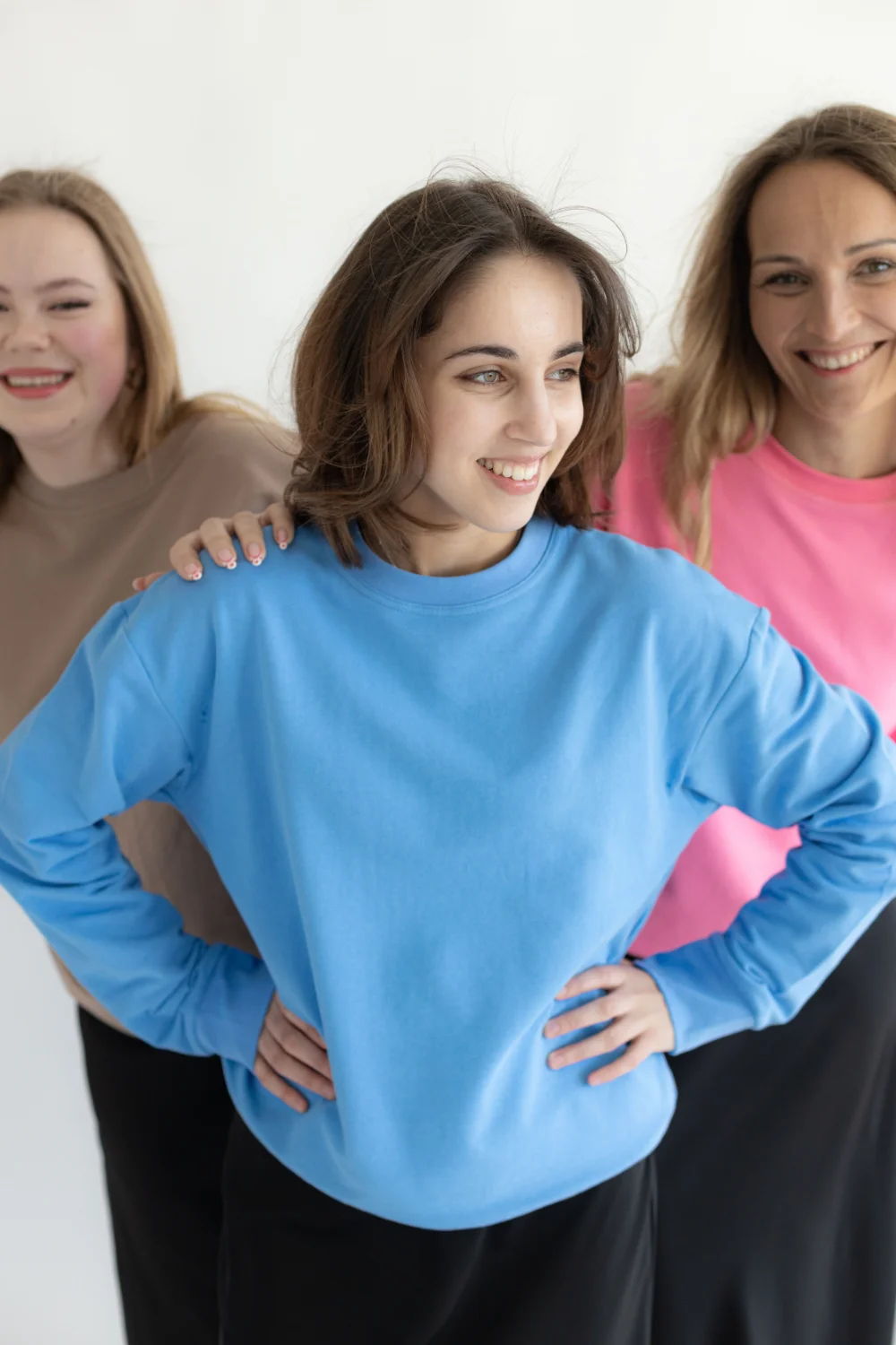 Šūts no kvalitatīvas un sertficētas kokvilnas trikotāžas. Auduma kreisajā pusē ir neliela pūciņa, bet pats džemperis ir vidēja biezuma, to noteikti varēsi kompakti salocīt un ielikt somā, ja paliek par karstu.