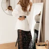 Caurspīdīgi mežģīņu virssvārki. Skaista un grezna melna mežģīne, svārku apakšmala īpaši apstrādāta.