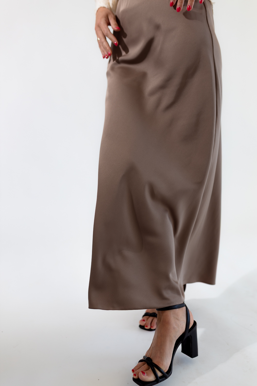 Maxi garuma slip svārki, kas šūti no satīna auduma. Viduklī iestrādāta gumija.