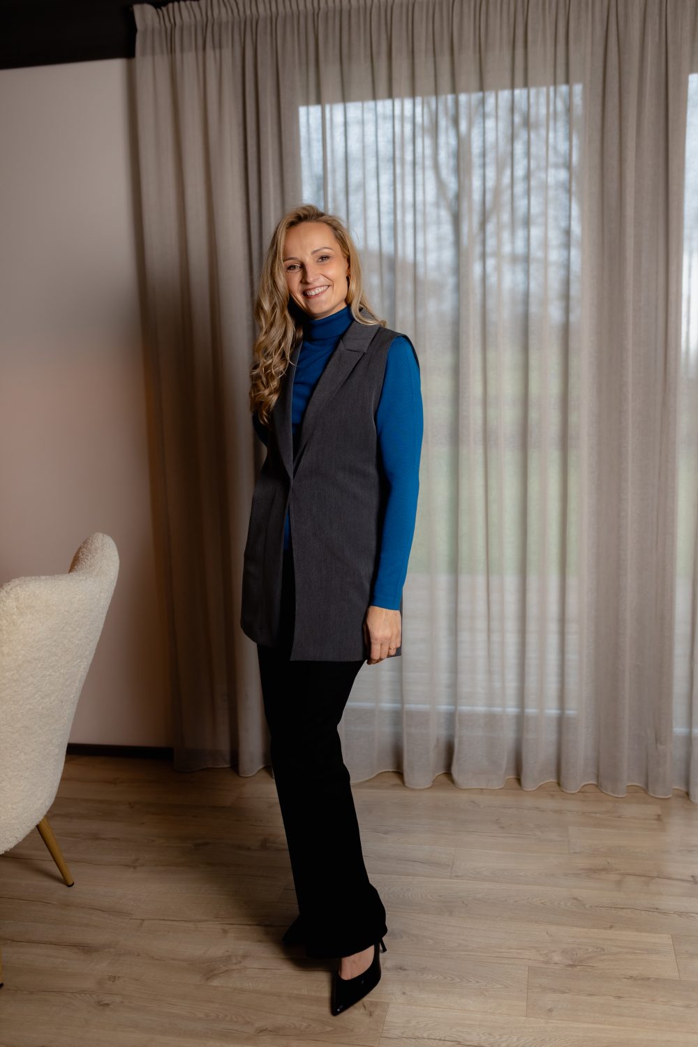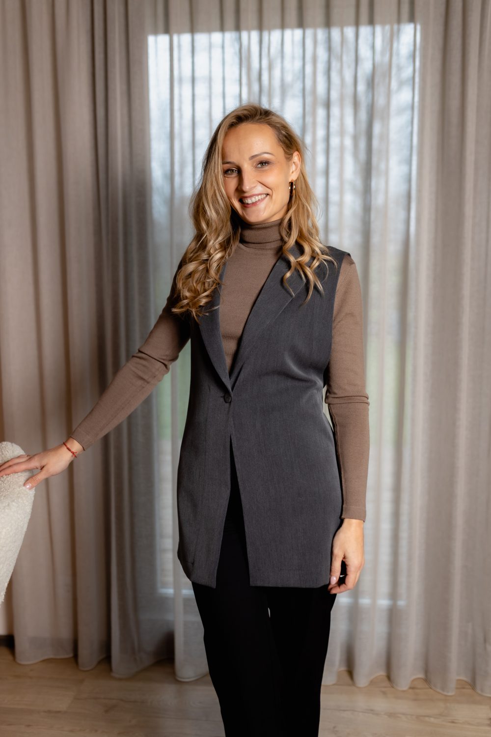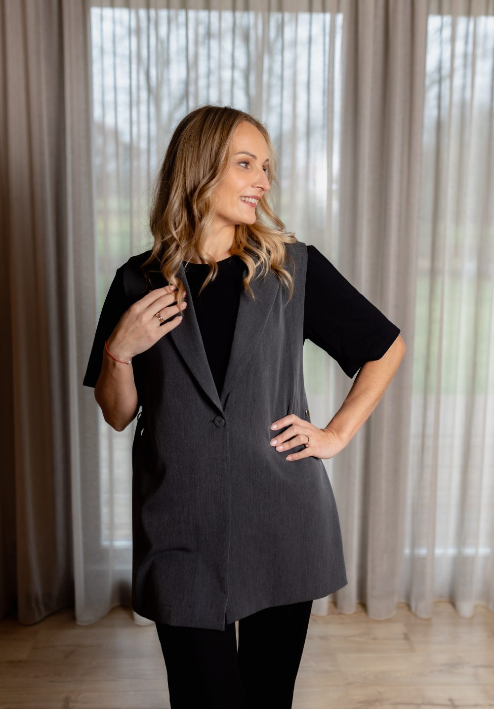 Veste ir lieliska alternatīva žaketei – velc to kopā gan ar kalsisko balto blūzi vai bāzes T-kreklu. Vēsajā laikā noteikti lielsiki izskatīsies arī ar bītleni. Vai kombinē to ar caurspīdīgo tilla topu, lai piešķīrtu tēlam odziņu.