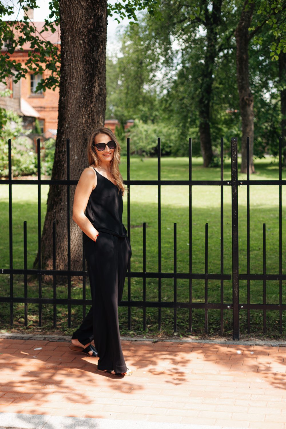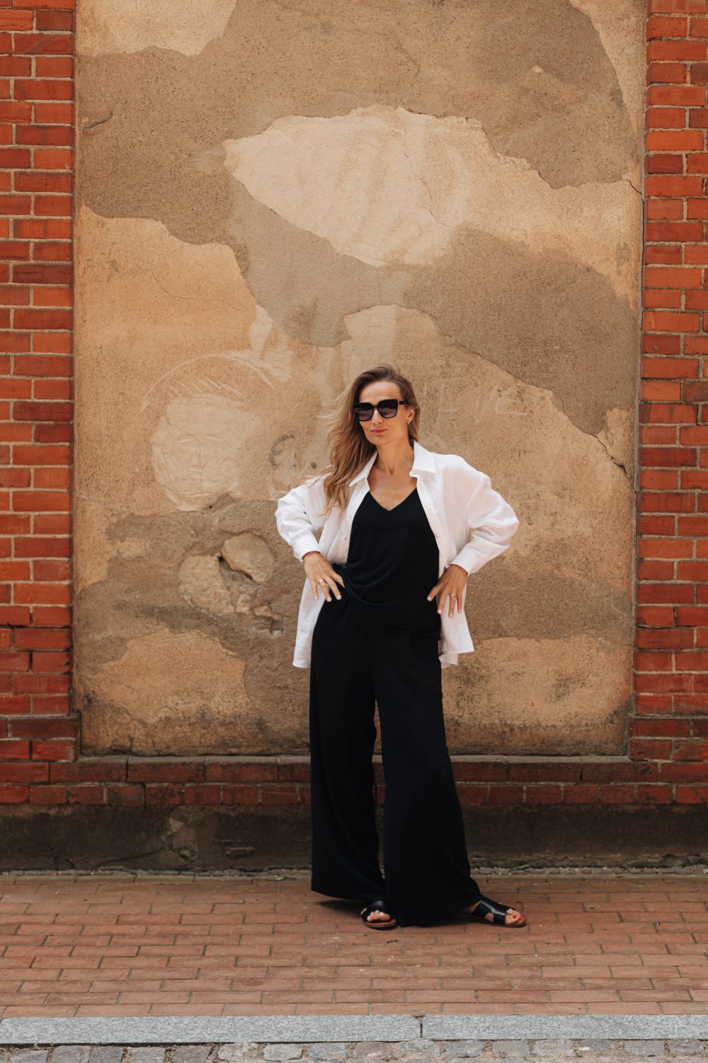 Brīva piegriezuma bikses, no ļoti patīkama un viegla premium poliestera auduma. Bikses ir uz gumijas, sānos iestrādātas kabatas. Pilnam komplektam pieejams slip tops no tāda paša auduma.
