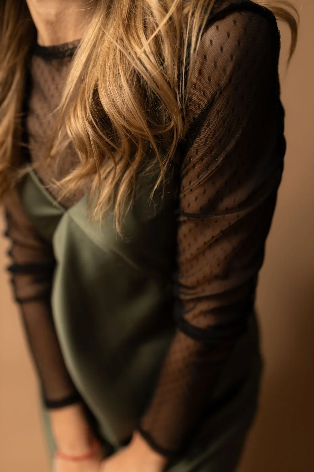 Caurspīdīgs tilla tops. Materiāls ļoti mīksts un patīkams ādāi – likrs sietiņš (audums no kura visbiežāk šuj apakšveļu).